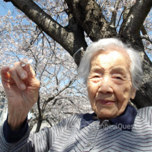 Kiyoko Kondō under cherry blossoms at age 109, spring 2023. (Photo provided by the nursing home)